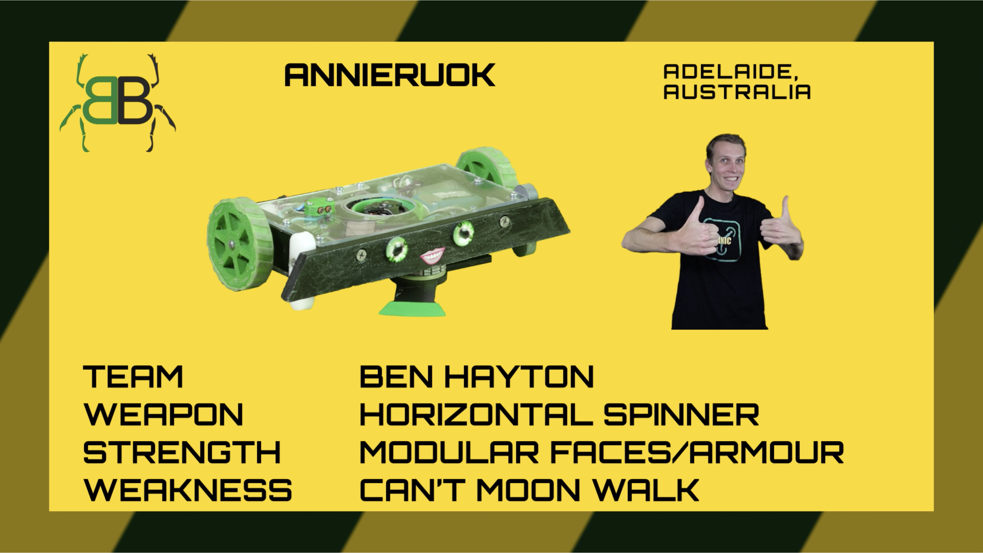 | AnnieRUOK hails all the way from Australia. Its team captain Ben is an experienced roboteer and hopes to go far in the competition. Will they become a speed demon and moonwalk to success? | |