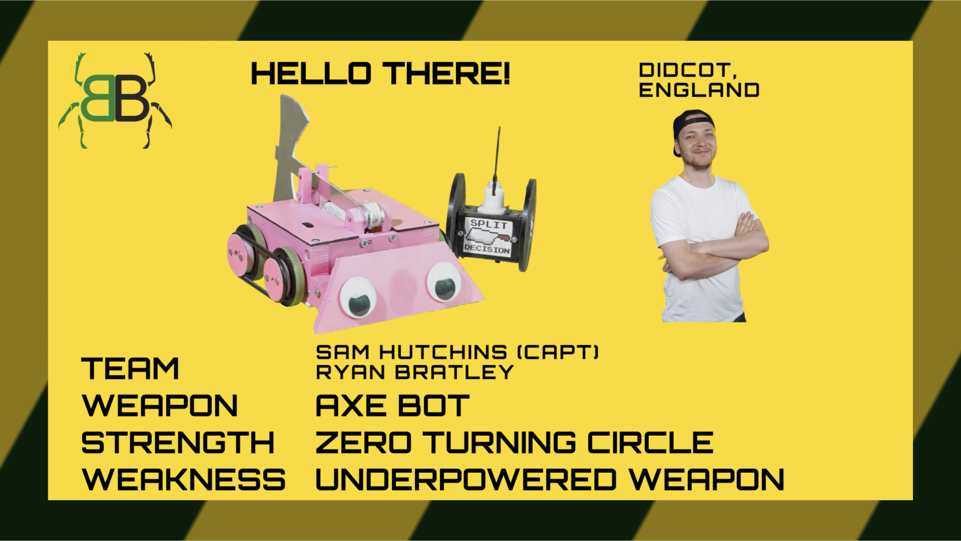 | Hello There! is a robot from the popular podcast duo Spinnerproof. Armed with googly eyes as their main weapon, their hope is that they will be enough for their opponents to be distracted in order to take the win. | |