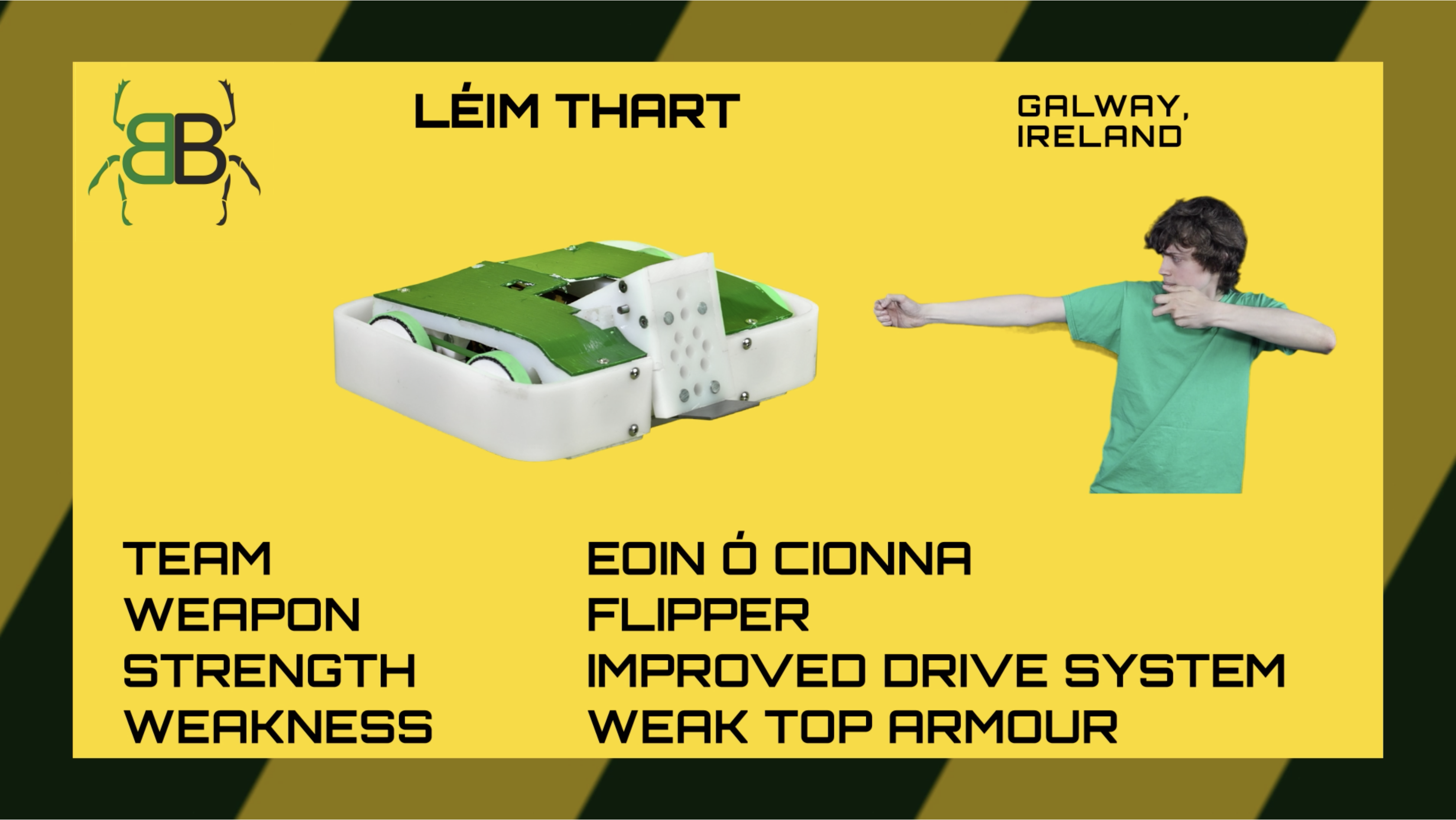 | Léim is back, with a beefier, chunkier setup. Entitled Léim Thart (Irish for Jump Around) for Bugglebots 2019, we hope to see it do exactly that in the arena! | |