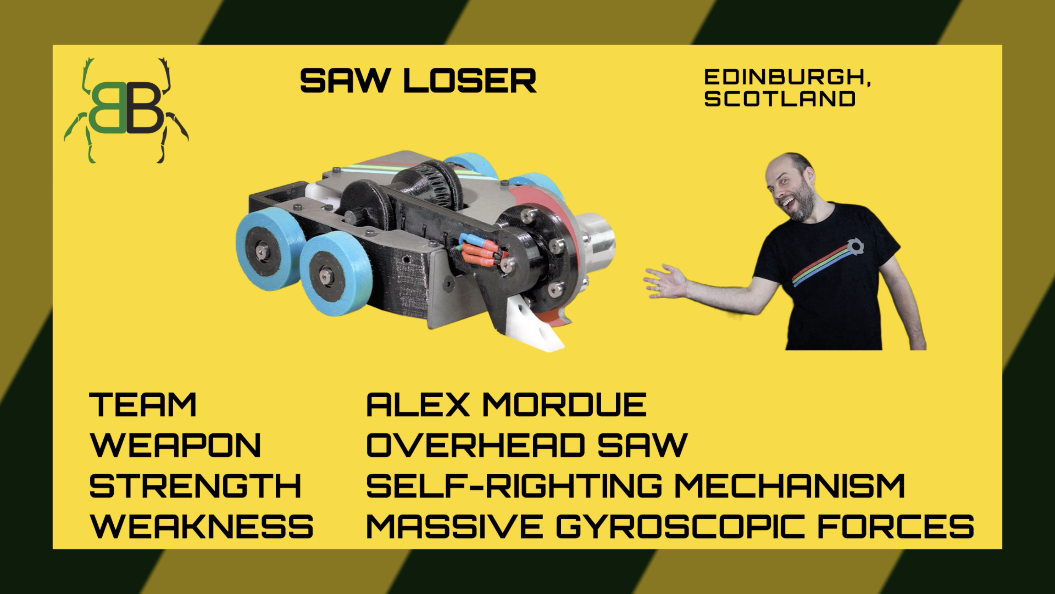 | Saw Loser returns with a vast number of improvements and a colour scheme change! Saw Loser was ironically sawn right through by Maximum Ogredrive in the Rumble Bee at Bugglebots 2018; but Alex is hoping he can go all the way this time. | |
