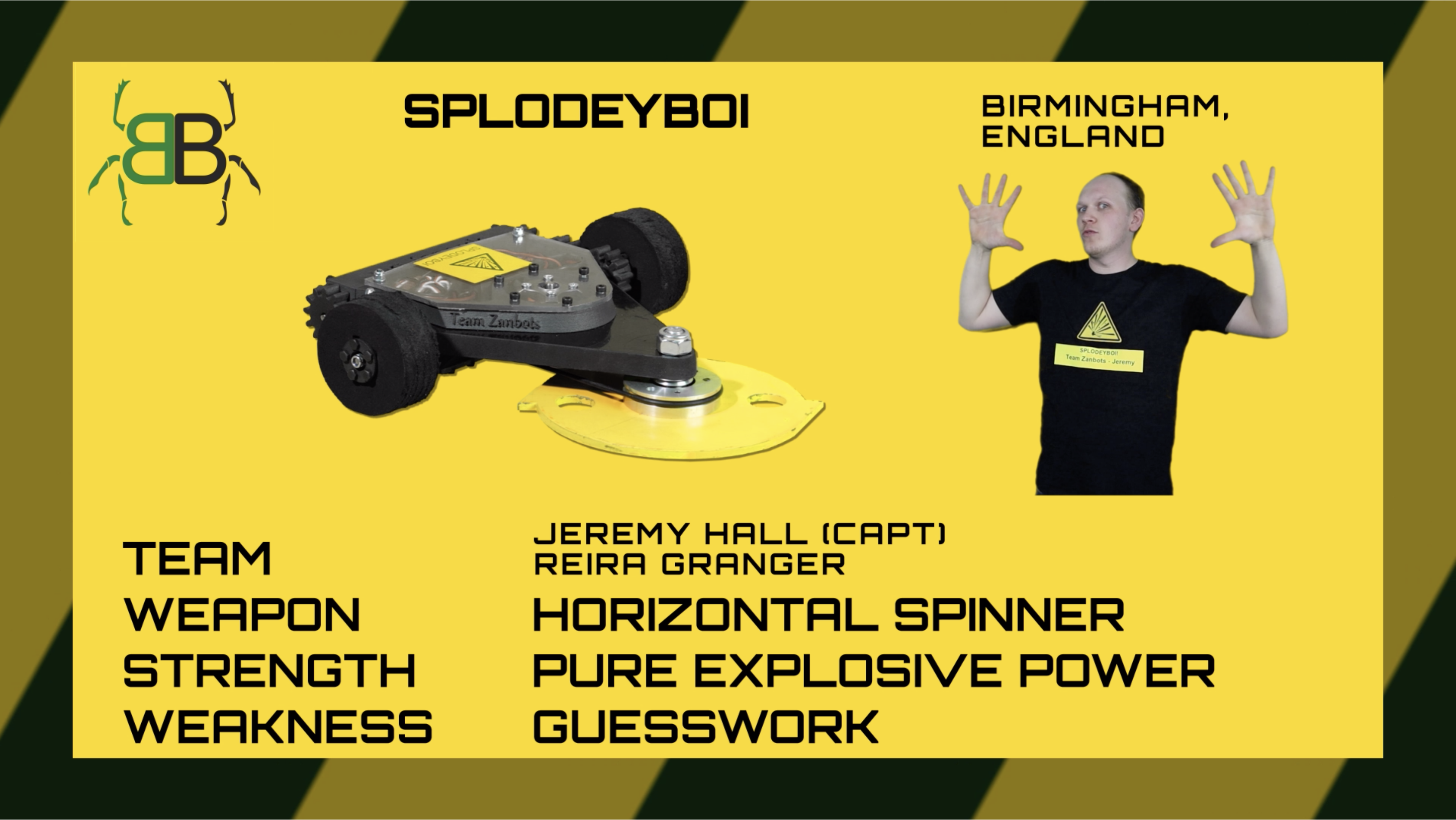 | Splodeyboi is a new build by roboteer Jeremy Hall. He hopes to cause utter destruction in the arena. With a heat lineup as stacked as his, anything can happen! | |