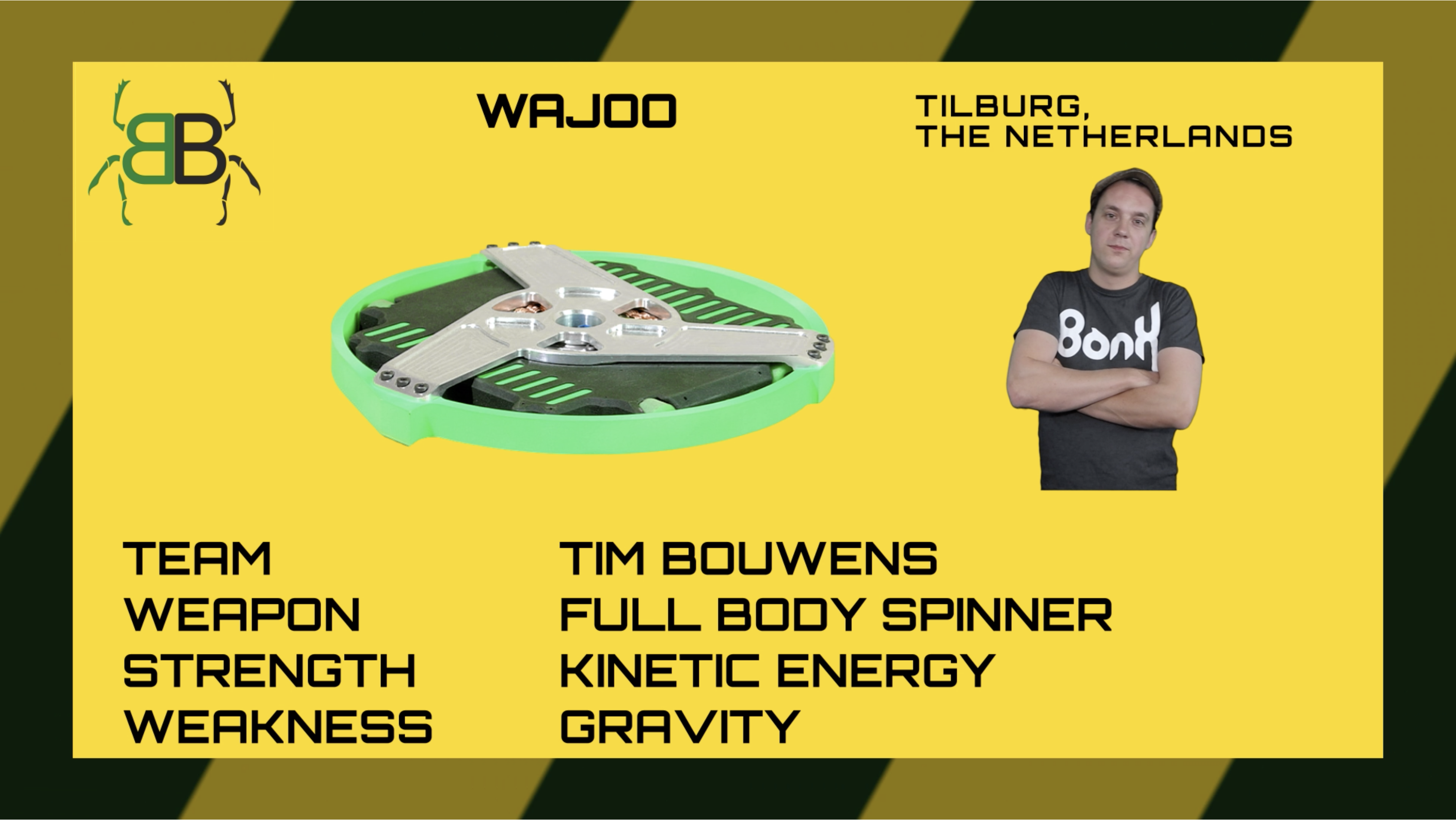Wajoo (pronounced: Why-yoo), is a full body spinner originating from the Netherlands. Its builder Tim Bouwens was part of the Tough as Nails team in the UK heavyweight televised shows.