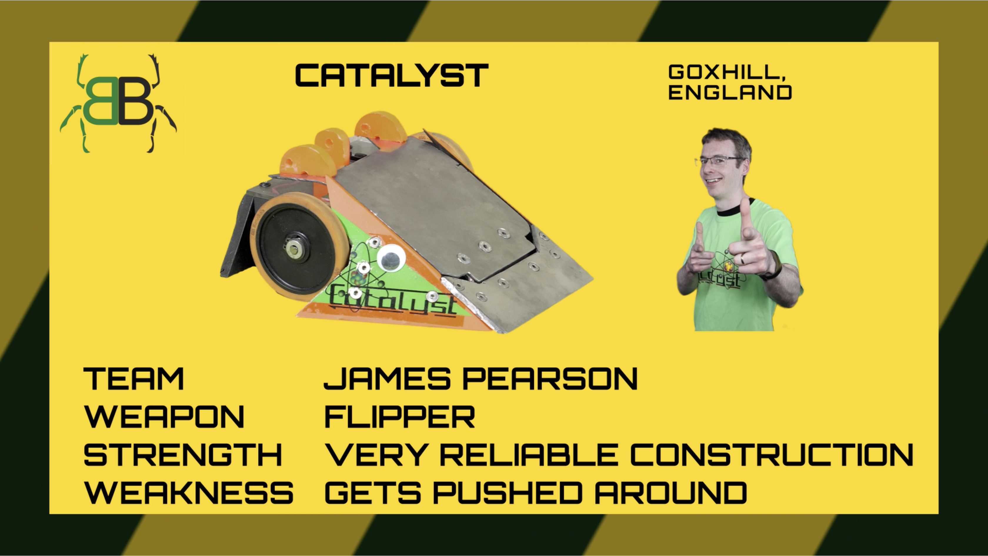 | Catalyst sports a front hinged lifter and has been competing at live events for a number of years. The captain, James was hooked on the UK heavyweight shows as a child and since then has aspired to build and compete at competitions across the country. He's at Bugglebots, what more could he want? | |