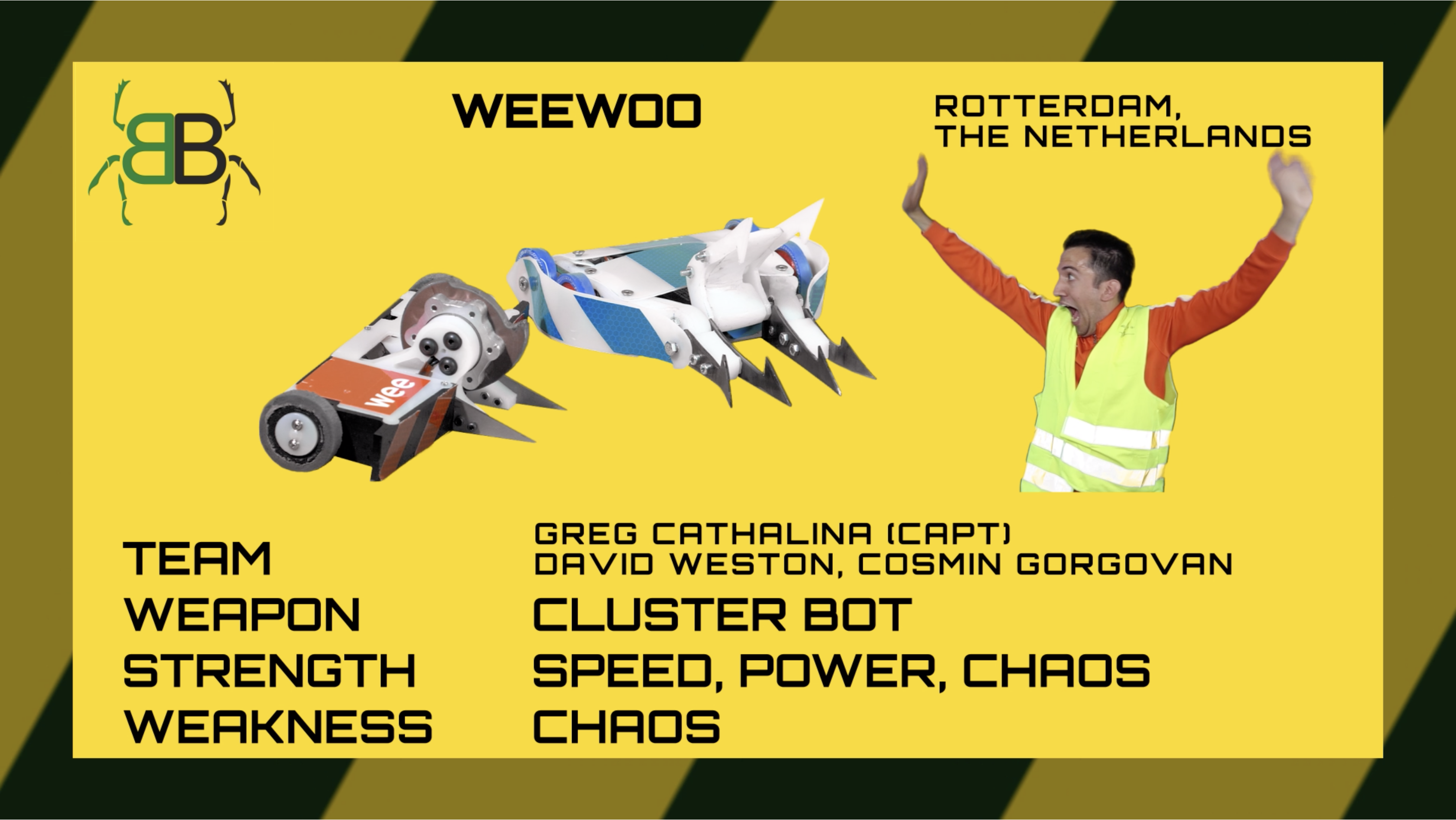 When I say WEE you say WOO! WEEWOO! WEEWOO!Our original cluster duo return to Bugglebots 2019. WeeWoo now sports a multi bot configuration which allow them to deal with different robots for different scenarios and ultimately help them claim damage points. |